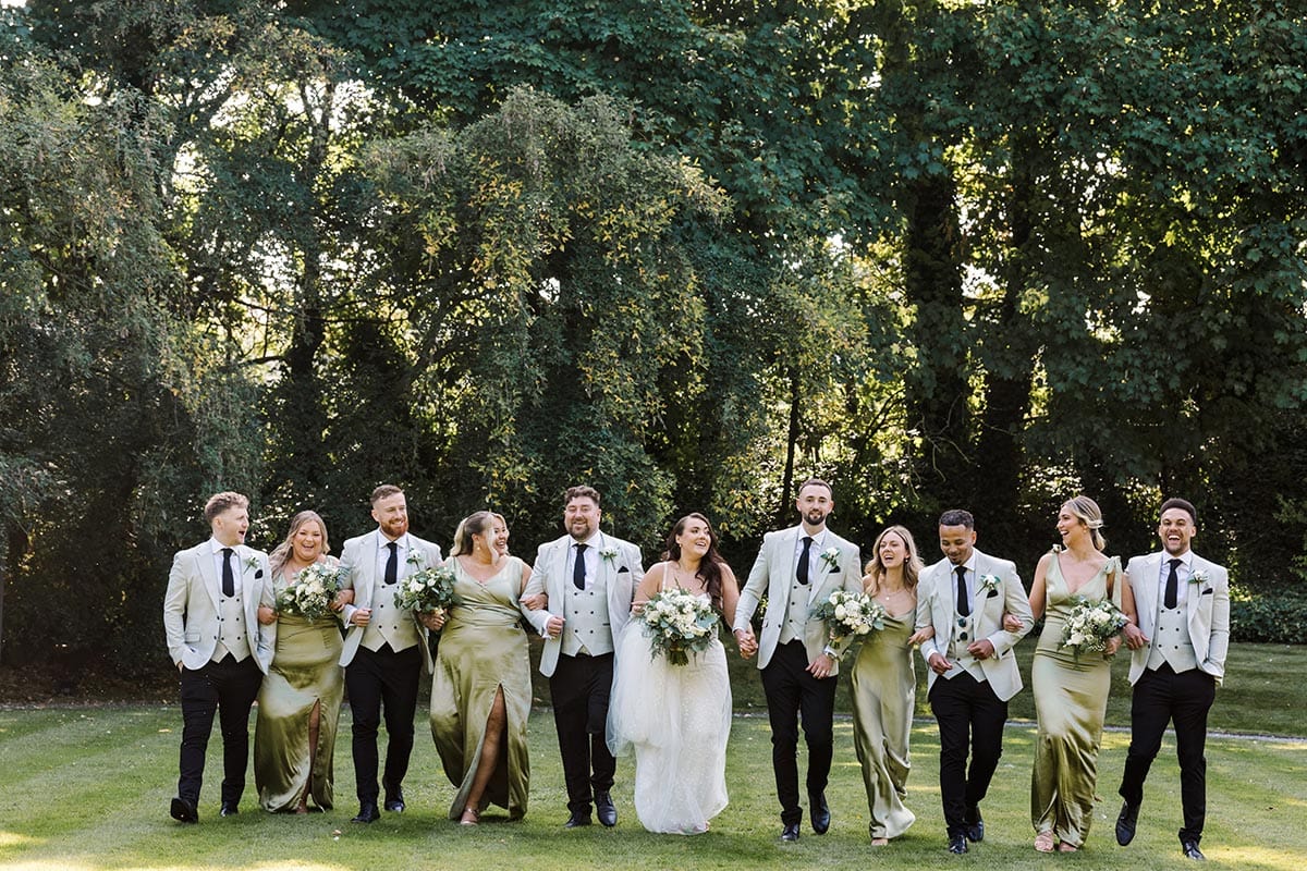 The couple chose a colour theme that harmonised perfectly with the setting—white wedding suits for the men and olive green bridesmaid dresses for the ladies, along with wedding bouquets and venue flowers in muted tones of green and white. Polly’s wedding dress added an extra touch of sophistication, with its delicate detailing and long train, while her bridesmaids’ silk olive dresses echoed the wedding day’s relaxed elegance.